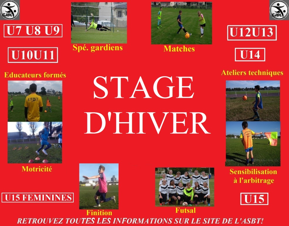Pendant les prochaines vacances de Février, du 24 au 28, un stage sera organisé pour les jeunes du club. 2 journées complètes des U7 aux U11 et 2 journées 1/2 des U12 aux U15 (programme complet ci-dessous).