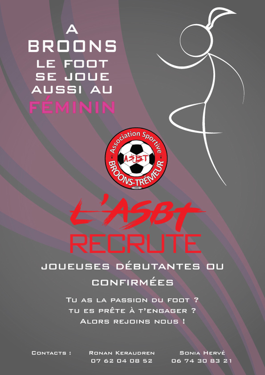Toutes les joueuses qui sont intéressées par le projet peuvent venir à la rencontre des responsables de l'équipe lors de l'Assemblée Générale du club le Jeudi 13 Juin à 19H00 à la salle des fêtes de Trémeur.